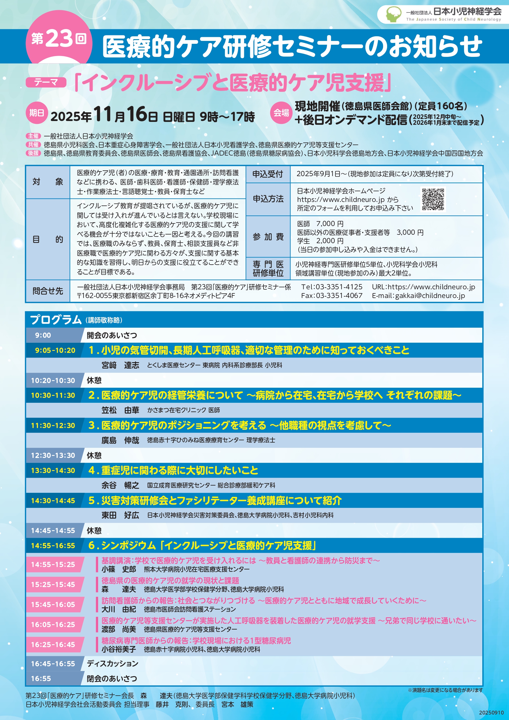 一般社団法人日本小児神経学会の主催により、『第23回 医療的ケア研修セミナー』が開催されます。