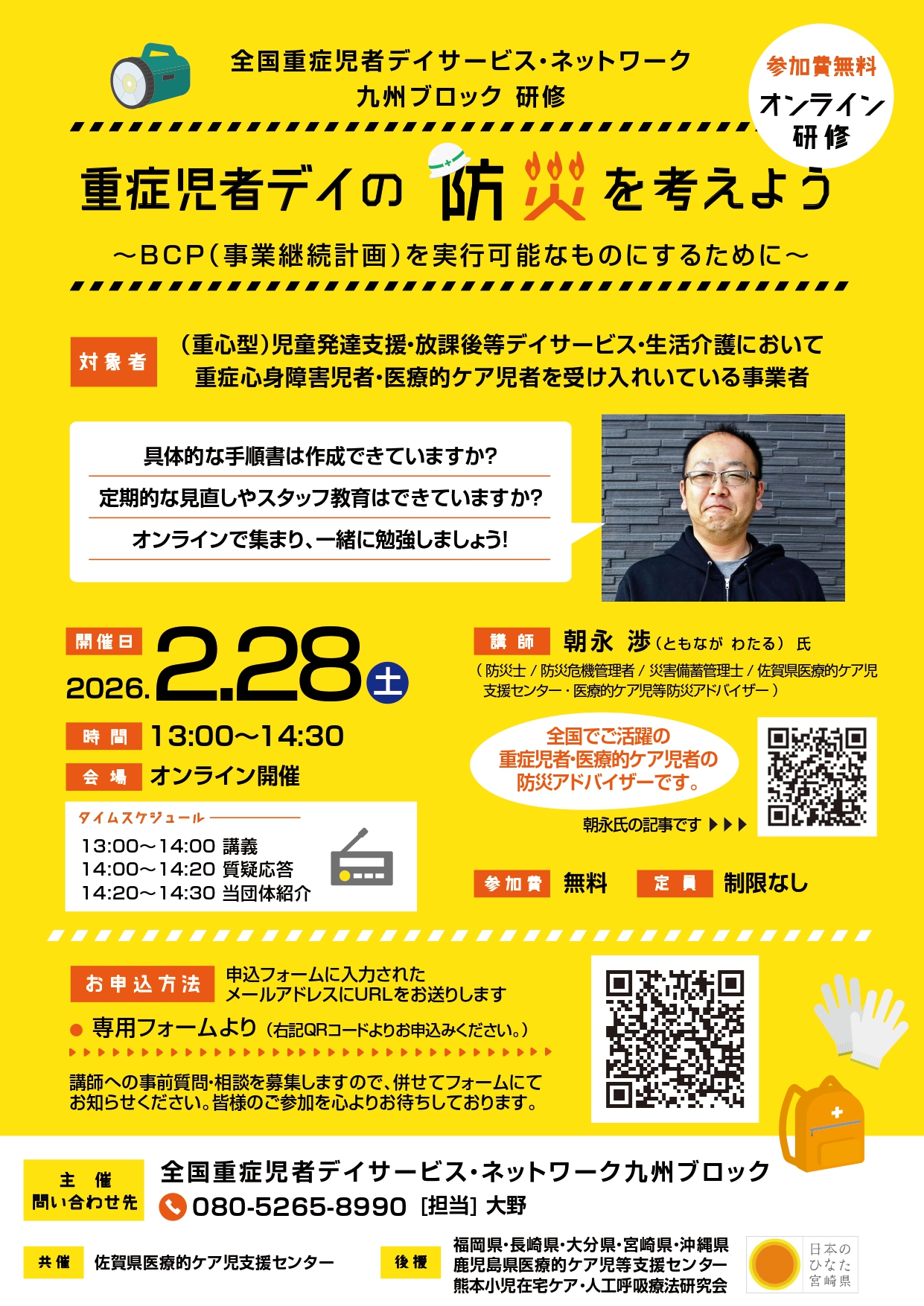 災害時に本当に動けるBCPになっているか、具体的な手順書まで落とし込めているか、スタッフ教育・見直しが継続できているか等、全国でご活躍されている防災士・医療的ケア児等防災アドバイザーの朝永 渉 氏を講師に迎え、現場に即した防災・BCPについて、実践的に学びます。