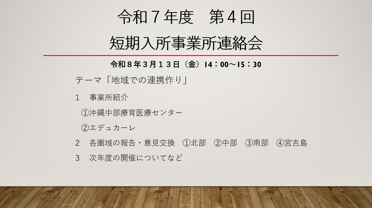 令和8年3月13日(金)に、『令和7年度 第4回 短期入所事業所連絡会』を開催しました。